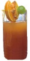 Alle Zutaten außer dem Orangensaft im Shaker mit Eis schütteln und in ein Cocktailglas mit Eiswürfeln geben. Mit Orangensaft auffüllen. Das Obst auf einen Sticker pieken und auf das Glas legen.